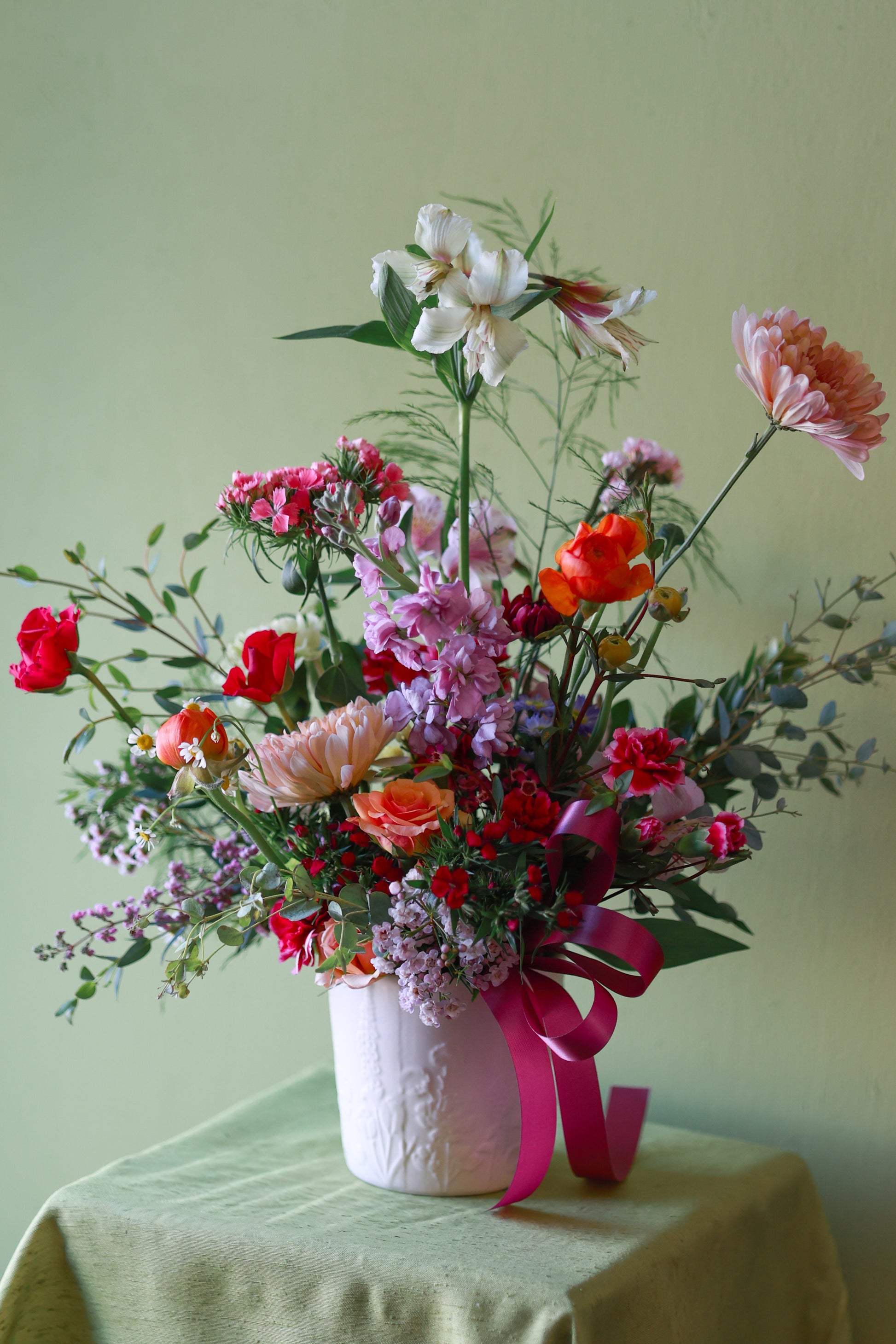 Photos reflect the overall size and style. Each arrangement is a florist’s choice, with seasonal flowers, colors, and vessels selected thoughtfully.